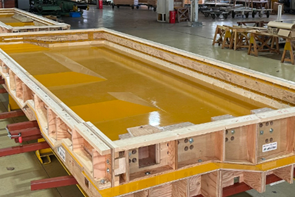 鋼製のPC型枠に比較して、軽量で加工が容易であるという木の特性を活かしたコスト面や施工性で優れたPC型枠です。弊社は、2022年と2024年に「木製PC床版型枠」関連の特許を2件取得しています。